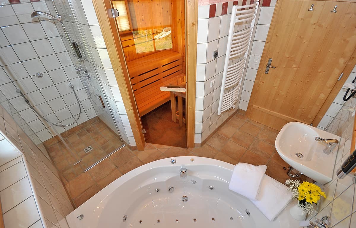 The ground floor of the Chalet Försterin includes a large farmhouse parlour with a tiled stove, large dining table and comfortable sitting area. Fully equipped kitchen made of spruce wood. Alpine wellness with bathroom, experience shower, whirlpool tub and pine sauna with Dachstein view. A large entrance hall with shoe dryer as well as a separate toilet and a wooden hut.