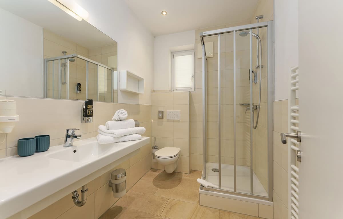 - bathroom with shower/toilet, make-up mirror, hairdryer and towel dryer
